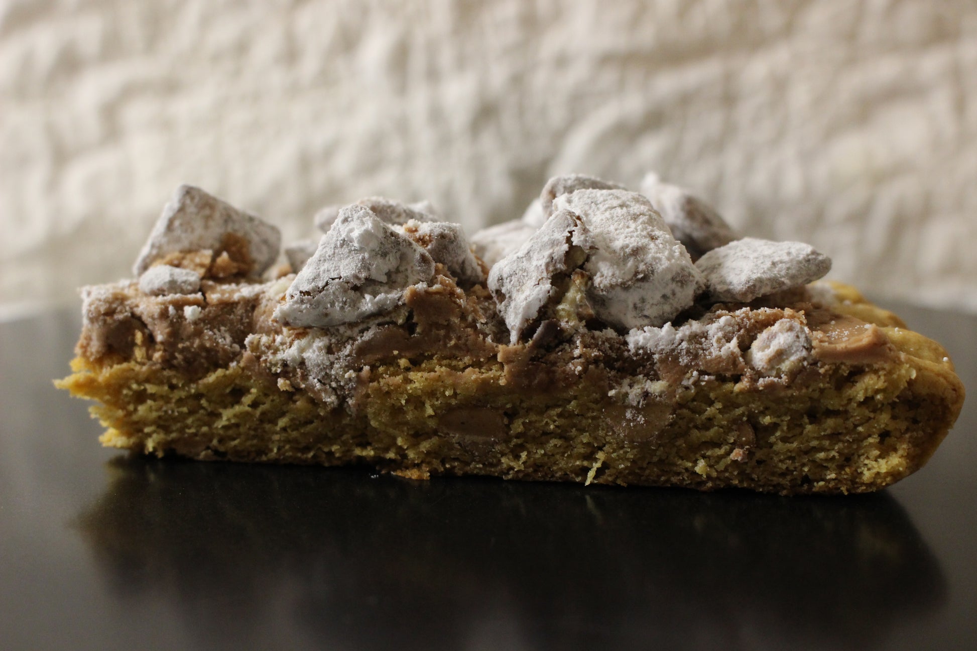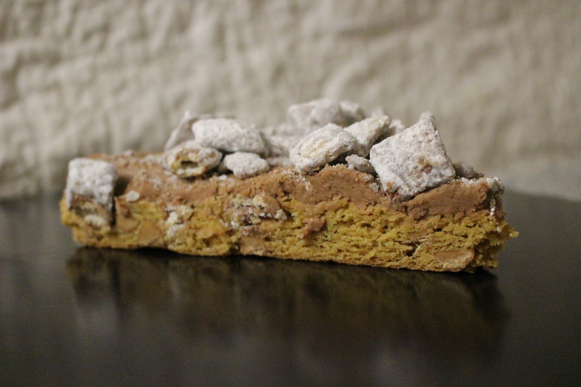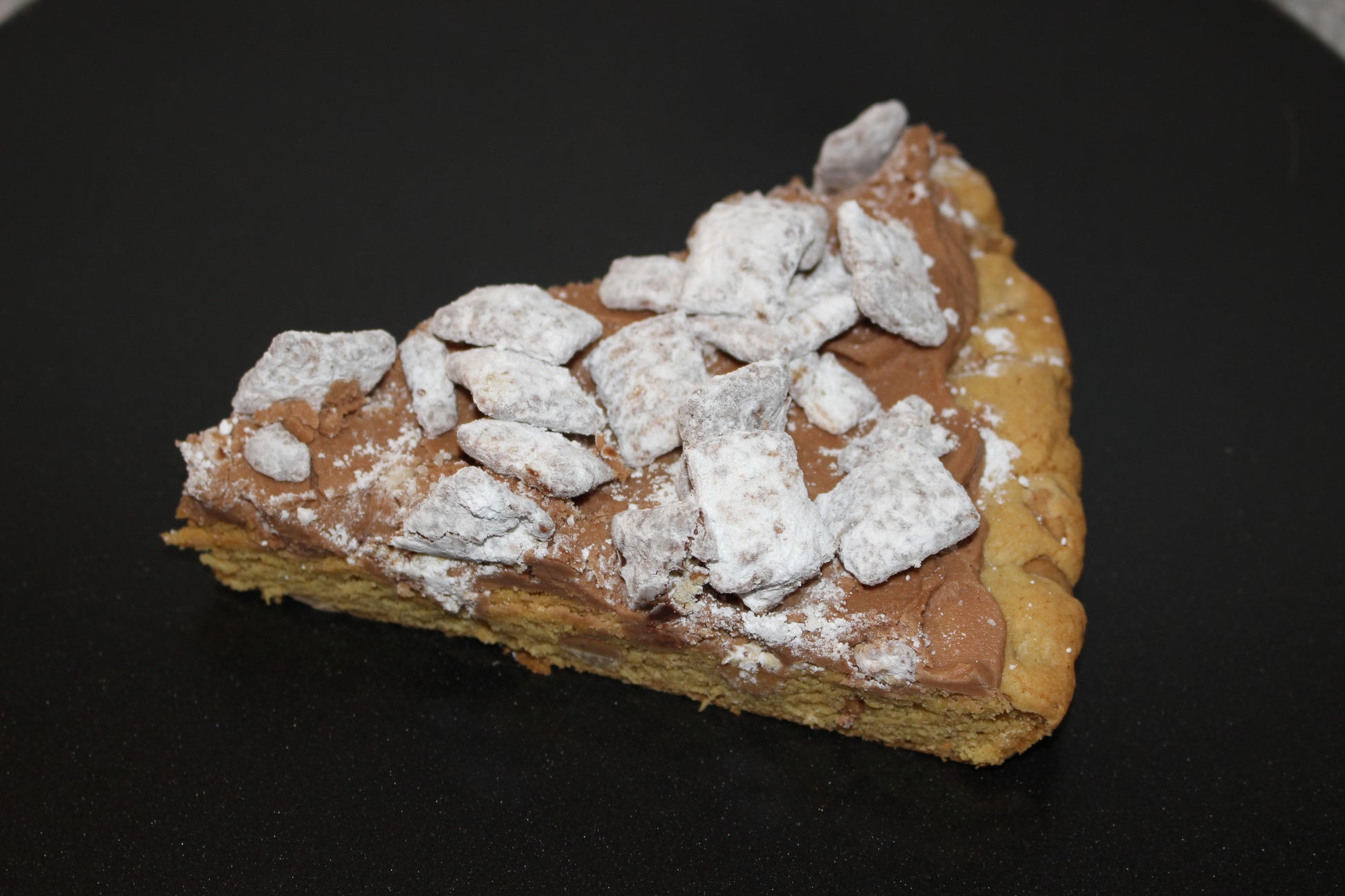 Our peanut butter cookie base lays down a smooth, creamy riff, while the chocolate topping shreds its way across the top like a face-melting guitar solo. But wait - cue the encore! We've covered it all in a crunchy, powdered sugar coated puppy chow for a finish that will leave your tastebuds ringing for more.